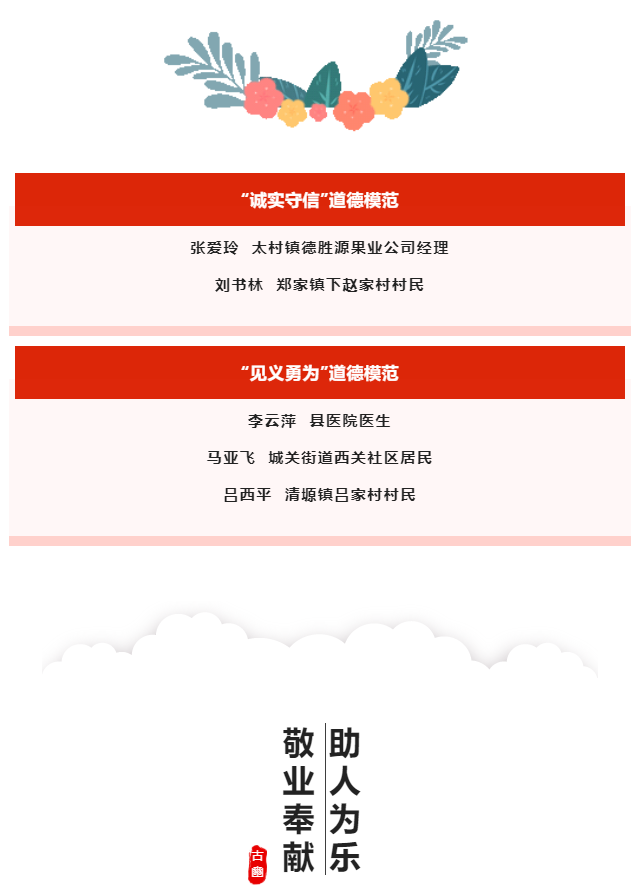 伟大时代呼唤伟大精神,崇高事业需要榜样引领。当前,我县正处于矢志追赶超越、奋力攻坚突破、全力加快县域经济高质量发展的关键时期,迫切需要弘扬传美德、树立时代新风、凝聚发展合力。希望全县广大干部群众,认真学习道德模范的先进事迹,学习他们播撒爱心、无私奉献的崇高境界,学习他们辛勤耕耘、锐意拼搏的工作状态,学习他们一心为民、服务群众的高尚情操,学习他们守信重诺、造福桑梓的优秀品德。要持续深入推进文明家庭创建,继承和弘扬革命前辈的家风家训,教育亲属子女树立遵纪守法、艰苦朴素、自食其力的良好观念,做家风建设的表率。要争做崇尚道德的践行者、文明风尚的维护者、幸福家庭的创造者,重言传、重身教,身体力行,耳濡目染,做到以德正人、以学育人、以文化人,为“全市创优秀、全省创一流、全国有亮点”提供坚强的思想保证、强大的精神力量、丰润的道德滋养,以实干实绩迎接党的二十大胜利召开!