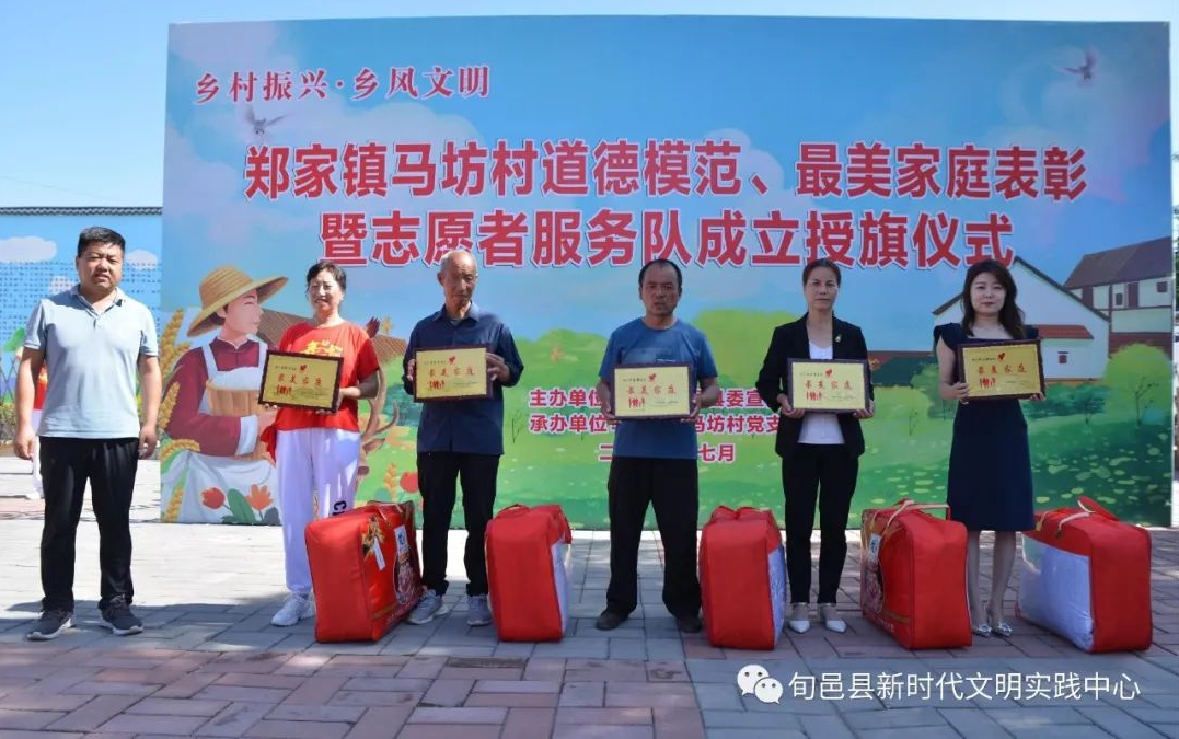 这次活动分为道德模范表彰、最美家庭表彰、马坊村志愿者服务队成立授旗仪式三项内容。据了解这次活动由县委宣传部主办,郑家镇马坊村党支部承办,本次道德模范、最美家庭通过民主推荐、民主投票等方式,涌现出了5名“好媳妇”、5名“好公婆”、3对“模范夫妻”以及5户“最美家庭”。同时,该村大力推进新时代文明实践工作,成立了马坊村村级志愿者服务队,有力推动了马坊村志愿服务活动开展,真正让志愿服务这一新时代文明实践的重要载体在该村落地生根、开花结果。